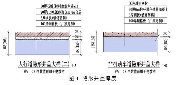 待混凝土初凝后,即可安裝隱形蓋板,并在隱形蓋板四周設置8mm厚鋼板,與預埋鋼板焊接,固定隱形蓋板位置。人行道上隱形井蓋鋪裝層采用2 cm厚1:3水泥砂漿(M10)結合層貼3cm厚花崗巖石材(石材與井蓋周邊人行道一致),非機動車道隱形井蓋鋪裝層采用3cm后6mm粒徑黑色強固混凝土并用無色透明密封,詳見圖1.隱形井蓋鋪裝層應與井蓋周邊路面順接相平。