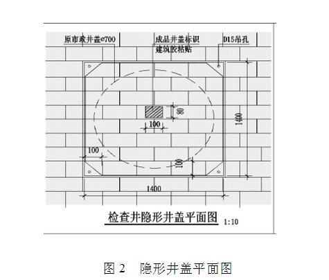 (2)市政檢查井隱形井蓋施工前,應根據所在地段鋪裝情況確定隱形井蓋總厚度,據此降低原市政井口標高,并預留5 0mm空隙以便隱形井蓋調平。騎線檢查井蓋需考慮采用多種鋪裝材料拼合而成,各種材料的顏色和質地應與周邊鋪裝相融合。