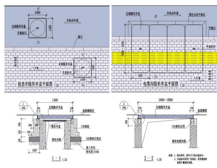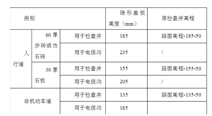 人行道上的隱形井蓋面層鋪裝和人行道面磚鋪裝材料一致,遇到盲道磚應與之順接,隱形井蓋橫跨非機動車道和人行道時,在隱形井蓋周邊加鋪一圈黑色平緣石,道路人行道鋪裝結構形式順接原人行道。