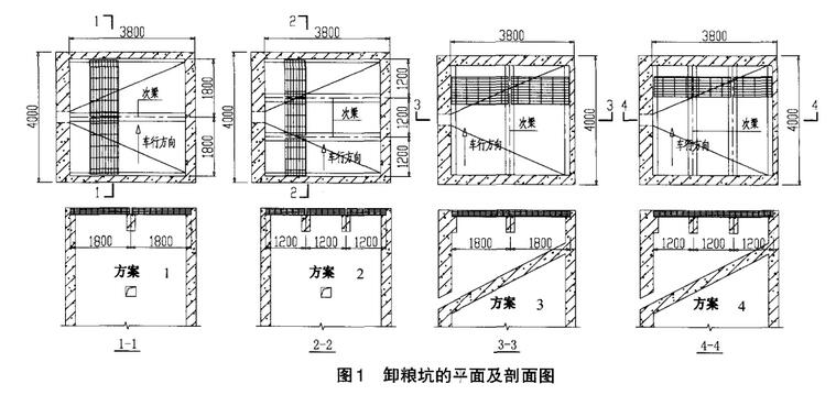 某糧食儲備庫一汽車卸糧坑,其上部鋪設(shè)垂荷載鋼格板,卸糧坑平面尺寸3.8mx4.0m,其平面及剖面詳見圖1。