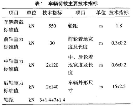 根據(jù)表I所列主要技術(shù)指標(biāo),車輛荷載的最大輪壓標(biāo)準(zhǔn)值為Gk=70 kN,根據(jù)《建筑結(jié)構(gòu)荷載規(guī)范)GB 50009-2001的規(guī)定,荷載設(shè)計(jì)值為G=70x1.4=98 kN.