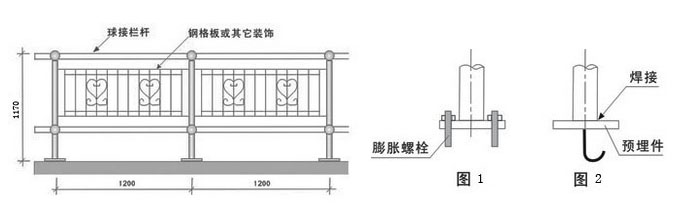 圍欄鋼格板高度一般為1170mm,也可按客戶需要的高度設計。鋼格板外的裝飾材料依據工藝選定管材也可棒材。欄桿、圍欄安裝方法及預埋件結構立柱用膨脹螺栓固定在混凝土基上或焊接在預埋件或鋼梁上;橫桿與橫桿或彎頭的接點經點焊刷漆后移入立柱的球接頭內。圍欄鋼格板結構圖如下: